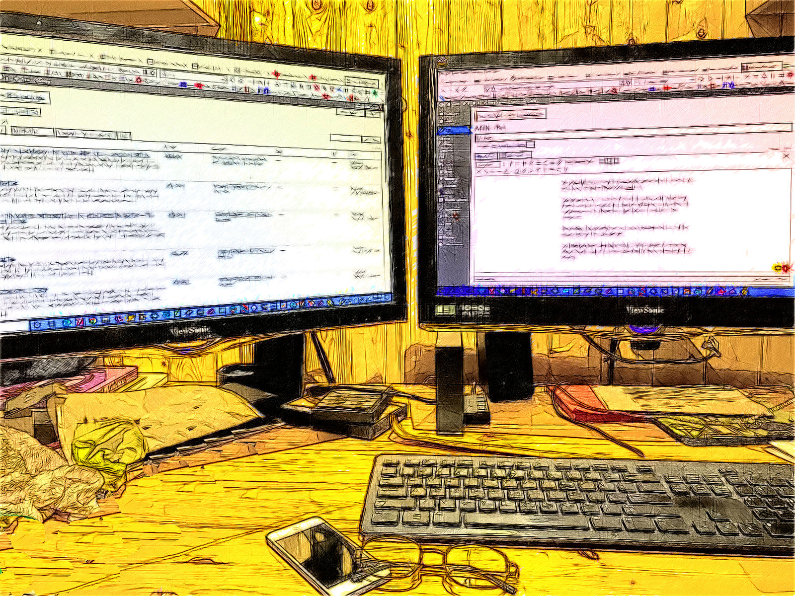 Karen uses a laptop and I normally use a dual-screen desktop PC—though, to be accurate, my computer is mounted under the desktop.